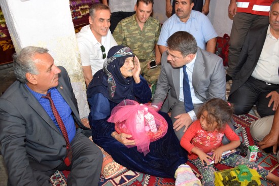 Şanlıurfa'nın Viranşehir Kaymakamı Ömer Çimşit, ilçe merkezine 35 kilometre mesafedeki Binekli Mahallesi'ne giderek 123 yaşındaki Hodi Gürkan'ı evinde ziyaret etti.
