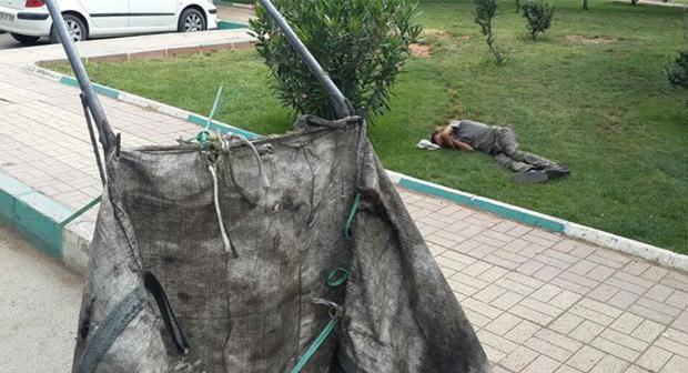 Şanlıurfa’nın Haliliye ilçesinde sabahın erken saatlerinde kağıt toplarken yorgun düştü. Yorgunluğunu gidermek için kağıt topladığı iki tekerlekli heybesi Veyselkarani Parkının kenarına bırakıp parkın çimenlerine uzandı. Dinlenmek için parkın çimenlerine uzanan çocuk bir süre sonra içi geçti ve derin uykulara daldı. Yanından geçenleri fark edemeyecek kadar uykuya dalan çocuk bu halini görenler onu uyandırmaya kıyamadı.
