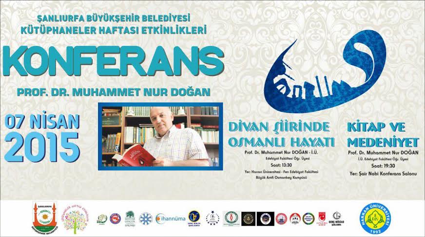 İstanbul Üniversitesi Edebiyat Fakültesi Öğretim Üyesi Prof. Dr. Muhammed Nur Doğan’ının konuşmacı olarak katılacağı konferans saat 13:30\'da Harran Üniversitesi Fen Edebiyat Fakültesi Osman Bey Kampüsünde ‘Divan Şiirinde Osmanlı Hayatı’ ve 19.30’da Şair Nabi Konferans Salonunda ‘Kitap ve Medeniyet’ yapılacaktır.