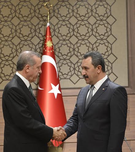 Türkiye Odalar ve Borsalar Birliği (TOBB) Başkanı M. Rifat Hisarcıklıoğlu, 81 il, 160 ilçeden gelen 365 Oda ve Borsa Başkanı ile birlikte Cumhurbaşkanı Recep Tayyip Erdoğan’a ziyarette bulunan Şanlıurfa Ticaret Borsası Yönetim Kurulu Başkanı Mehmet Kaya, Erdoğan’a hayırlı olsun dileklerinde bulundu.