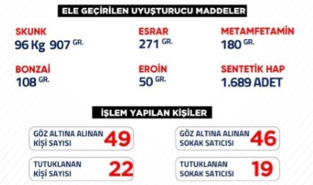 Operasyonlar ile ilgili ayrıntılarda ise; 96 kilogram 907 gram skunk, 271 gram esrar, 180 gram metamfetamin, 108 gram bonzai, 50 gram eroin maddesi ile bin 689 adet sentetik hapın ele geçirildiği ve yakalanan 49 şüpheliden 22’sinin tutuklandığına yer verildi.