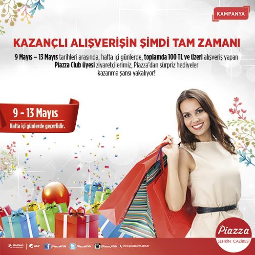 Dört mevsim farklı kampanyalar ve fırsatlar sunan Şanlıurfa Piazza AVM, 9-13 Mayıs tarihleri arasında toplamda 100 TL ve üzeri alışveriş yapan Piazza Club üyesi ziyaretçilerine sürpriz hediye kazanma şansı veriyor.