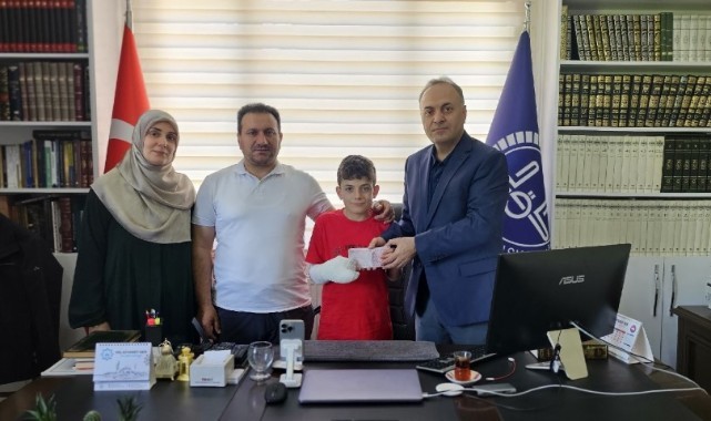 Anne ve babasıyla beraber Siverek İlçe Müftülüğüne gelen Mehmet Emin Aymelek, kumbarasında biriktirdiği harçlıkları İlçe Müftüsü Muhammed Çiçek’e teslim etti.